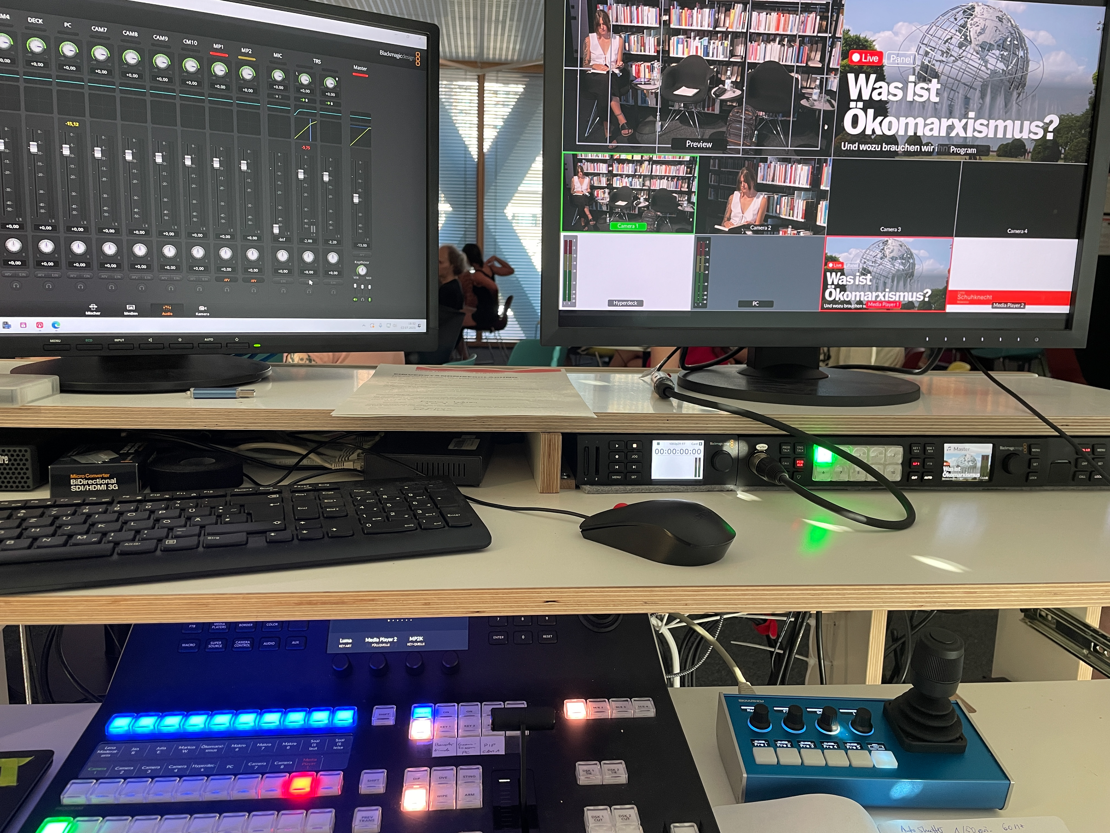 Technik: 2 PTZ-Kameras (4K) und geregelte Tonsumme von der PA/Beschallungsanlage (Summe der Mikrofone), ATEM-Videomischer, Encoder, Kamerafernsteuerung, PC für den Live-Schnitt und Live-Stream zu YouTube und Facebook